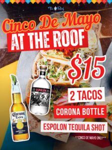 $15 – 1 Bottle of Corona, 1 shot of Espolon Tequila, and ANY 2 tacos from our menu!